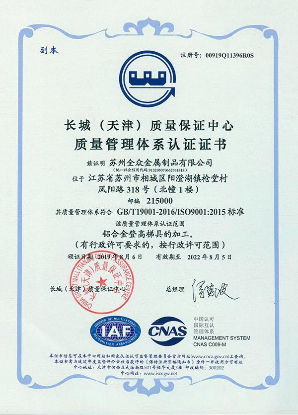 新利官方版网站登录入口成立于2013年3月,注册资本500万元,是一家从事铝合金登高工具生产及销售的企业,新利官方版网站登录入口坐落于“人间天堂”苏州市,毗邻阳澄湖度假区,交通十分便利。在铝合金产品加工有着很深厚的底蕴和丰富的经验。同时是铝合金登高产品解决方案的供应商。公司通过ISO9001质量管理体系认证,将公司发展的步伐向前迈进一步。