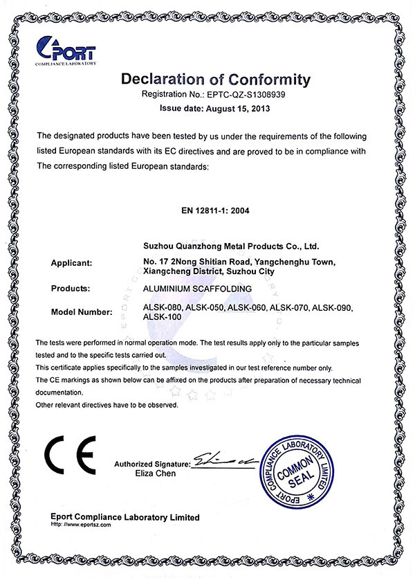 新利官方版网站登录入口专注铝合金制品的开发“产品就是人品”的企业理念,不断进行技术创新、设备创新、服务创新、和管理方式创新来继续研发出更多满足未来发展需要的产品, 公司产品通过欧盟认证取得CE认证并取得证书,铝合金脚手架系列产品通过SGS认证,铝合金平台和梯具类产品均严格按照GB12142-2007,GB17888等标准设计生产。